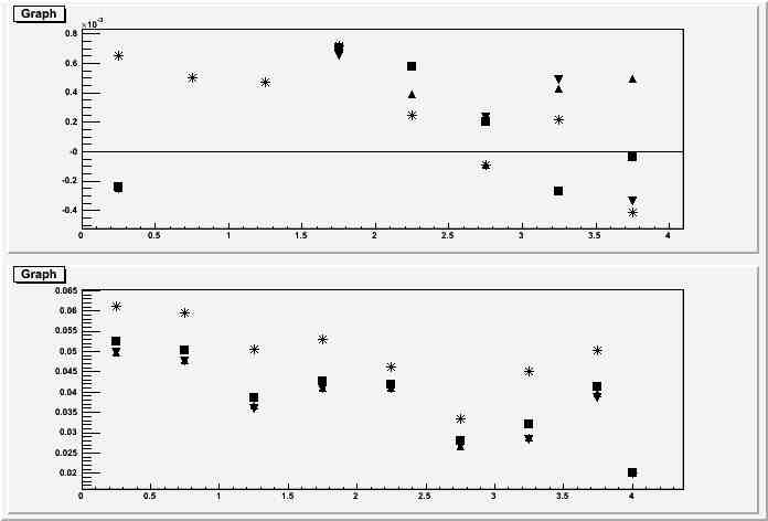 multi-muon sampleの残差のサイド依存を調べた。運動量を10GeV以下、20GeV以下、30GeV以下、30GeV以上にわけて、サイドはそのままプロットした。ということは外側内側の順になっている。残差最後の点はスケールのためのダミー。下段が残差、上段が平均。