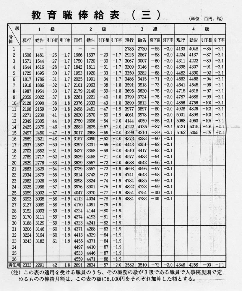 添付した2002年人事院勧告給与表で、教育職(ニ)高校の大卒教諭採用は2級2号俸、講師採用(?)は1級7号俸。教育職(三)幼稚園、小学校、中学校の大卒教諭採用は2級5号俸、講師採用(?)は1級7号俸。3級は教頭、4級は校長の給与表。これからモデル給与のグラフを作成してみても良い。